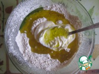 Смешать масло, сливки, миндальный экстракт, добавить в мучную смесь. |
