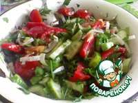 В процессе приготовления курочки и пюрешечки, приготовим всеми любимый и достаточно простой салатик. Помидорчики, огурчики, зелёный лучок, петрушечка, укропчик, заправим растительным маслицем. |