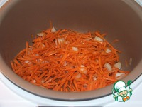 В мультиварку наливаем масло, засыпаем лук, морковь и жарим минут 10, иногда помешивая. |