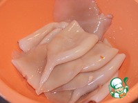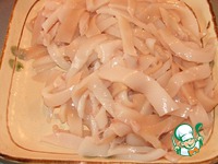 Кальмаров чистим, режем, как вам больше нравится. |