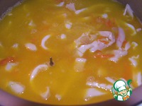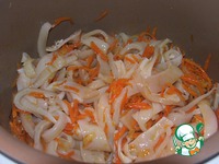 Пока резали кальмары, наши овощи обжарились. В них закидываем кальмаров, солим, перчим, добавляем лаврушку и перец горошком. Перемешиваем, но не жарим. |