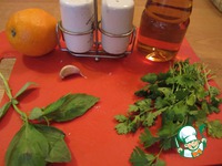 Теперь займемся приготовлением заправки. Для этого мне понадобится 1 апельсин (сок ~ 50 мл), 2 ст. л. яблочного уксуса, зелень кинзы, 1 веточка базилика, 1 зуб. чеснока, соль и перец по вкусу. |