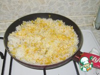 Содержимое сковороды посолить, поперчить. Добавить в сковороду рис, который предварительно поварить минут 7 (до полуготовности). |
