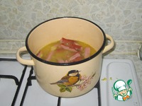 Отдельно сварить куриный бульон. (Мне для этого понадобилась 1 куриная ножка). Рис с овощами переложить в кастрюлю с бульоном. Добавить сосиски. Варить 15 минут. |