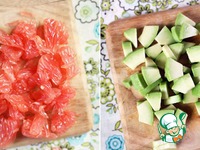 Готовим остальные ингредиенты. Грейпфрут избавить от кожуры, белого слоя и мембраны, разобрать на небольшие кусочки. С авокадо снять кожуру и нарезать. |