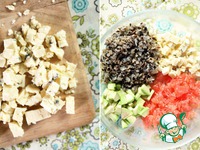 Сыр нарезаем небольшими кубиками. Все ингредиенты складываем в посуду для смешивания. |