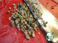 Чеснок чистим, с розмарина обрываем листочки, все рубим ножом со щепоткой соли до кашицы. |