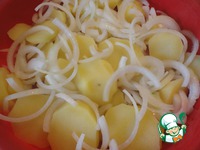 Выкладываем картофель с луком в форму, где будем его запекать. Если у Вас нет подходящей формы, то можно ее сформировать из двойной фольги. |
