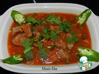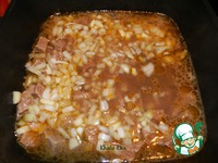 Когда мясо станет мягким, добавьте в кастрюлю мелко нарезанный лук и чеснок. Тушите 10 минут. |