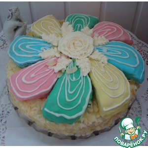 Сверху положить куски торта в виде цветочка. Оставшейся белой глазурью заполнить кондитерский мешок и нарисовать орнамент. Посыпать лепестками миндаля. |