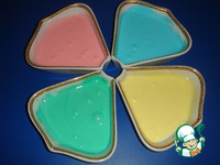Глазурь разлить в четыре емкости (оставив немного для орнамента) и окрасить в желтый, зеленый, голубой и розовый цвета. |