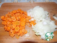 Нарезаем лук и морковь. Отправляем жариться лук примерно на 2 минуты.. |