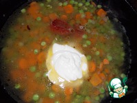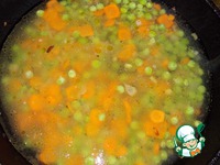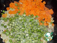 Затем добавляем к луку морковь и горошек и обжариваем еще минуты 2. |