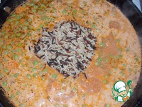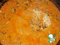 Затем доводим овощи с соусом до кипения.. Как соус закипел, добавляем туда рис, перемешиваем и тушим на медленном огне 25 минут. |