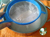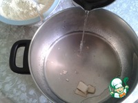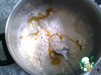 В полученную жидкость, не дожидаясь ее остывания, просеять 140 г белой пшеничной муки. |