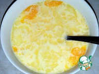 Сливки вылить в пиалу. Разбить яйца и высыпать сахар. Хорошо перемешать. |