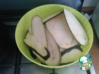 Баклажаны, моем и нарезаем их вдоль очень тонко (около 2-3 мм толщиной) на язычки. |