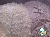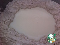 Делаем в муке углубление и выливаем туда кефир. Хорошенько все перемешиваем и собираем массу руками в шар. |