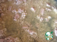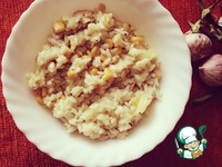 Влить вино и тушить на небольшом огне, пока рис не впитает в себя всю жидкость. Затем увеличить огонь и вливать небольшими порциями бульон или горячую воду. Посолить, поперчить, добавить базилик. |