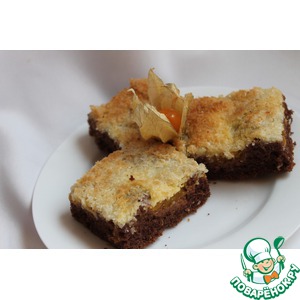 Готовый пирог достаем и даем ему отдохнуть. Затем нарезаем на квадратики и подаем к чаю! Можно подавать со взбитыми сливками. |