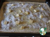Сверху заливки посыпаем смешанным кокосом с сахаром. И сверху кусочки масла кладем. Ставим опять в духовку на 20 минут. До готовности. |