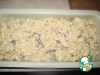Макароны перемешать с бульоном, 50 г. натертого сыра, влить сливочно-яичную массу. Аккуратно перемешать. Выложить в прямоугольную форму. |