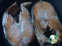 Стейки лосося посолить и оставить на 15-20 минут. Потом обжарить с двух сторон на растительном масле до румяности. |