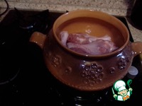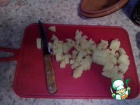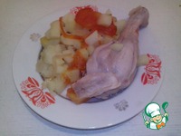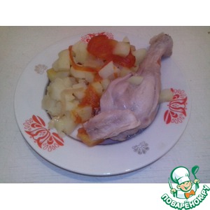 Итак, подготавливаем продукты. На дно горшочка нарезаем один помидор, после чего очищаем куриные голени от шкуры. Снимается она довольно просто. Зачем мы это делаем? Потому что куриная кожа - источник гигантского количества холестерина. Даже если мы приготовим блюдо с кожей - весь холестерин останется в блюде, и если мы не будем кушать приготовленную шкурку - сами понимаете, холестерин мы все равно съедаем с блюдом. Именно поэтому, чтобы не кушать холестерин, мы избавляемся от кожи. Далее мы выкладываем голени на помидоры и солим. |