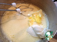 В это время 1 яйцо и 1 белок взбить миксером с 4 ст. л. сахара до получения пушистой однородной массы, добавить сметану и размягченное сливочное масло. |