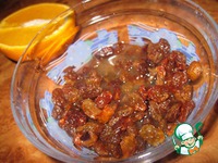 Изюм промыть, ошпарить кипятком. Замочить изюм в соке из половины апельсина. |