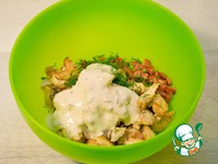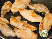 Кусочки филе посолить, поперчить и обжарить на растительном масле до золотистой корочки. Нарезать на кусочки. |