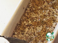 В форму для кекса выкладывайте часть теста, на нее орехи, поливайте их медом и закрывайте оставшимся тестом. |