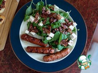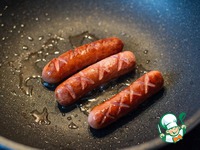 Обжариваем его на сухой сковороде, затем перекладываем на салфетку, чтобы стёк лишний жир. На той же сковороде обжариваем сосиски. |