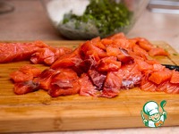 К сметане и луку, добавляем яйца, специи, размятый вилкой сыр горгонзола. На тесто выкладываем форель, заливаем смесью. |