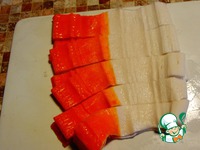 Крабовые палочки разворачиваем и разрезаем на широкие полоски. |