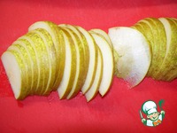 Грушу нарезать тоненькими ломтиками, выложить на листья. |