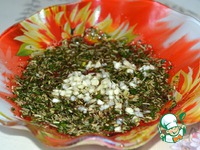 Для маринада смешиваем масло, прованские травки, розмарин, сухую петрушку, солим и перчим. Мелко рубим 2 зубчика чеснока и добавляем к маринаду |