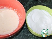 Желтки с сахаром взбиваем добела. Белки с солью до крепкой пены. |