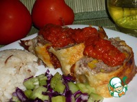 Разрезаем рулет на несколько частей, поливаем горячим томатным соусом. ПРИЯТНОГО АППЕТИТА!!! |