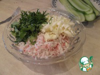 На терке натрите плавленый сырок и крабовое мясо (здесь можно также использовать крабовые палочки - абсолютно не принципиально!) Добавьте зелень, перемешайте |