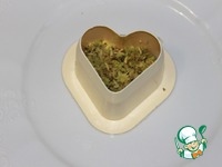 Начинаю сборку. Лучше это делать на той тарелочке, на которой будете подавать закуску: в формочку укладываю пластинку картошечки, на нее пюре из авокадо |