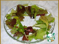 На тарелку выкладываем листья салата, у меня салатный микс (но также и без салата можно подавать, все равно будет вкусно). |