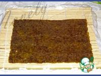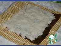 Хочу еще показать вариант типа "рассыпанных роллов", это если крутить их не получается. Разрезаем лист нори на четыре части, в небольшой формочке на лист нори кладем немного риса. |