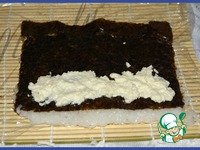 Преворачиваем нашу заготовку рисом вниз. С одного края кладем немного творожного сыра. |