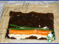 На сыр укладываем крабовые полочки, несколько перышков зеленого лука. Заворачиваем ролл с помощью циновки. Сфоткакть я это не смогла, руки были заняты ))) |
