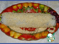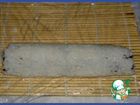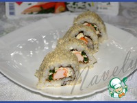 Обваливаем его как следует в кунжуте. Кунжут можно предварительно слегка подсушить на пустой сковороде или в микроволновке. Оставляем ролл полежать минут 15, сразу не режем. |