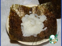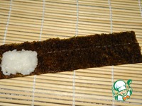 Или еще вариант, наподобие Гункан-маки. На полоску листа нори выкладываем рис и оборачиваем как бы нори вокруг риса. |