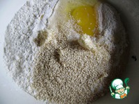 В это время смешиваем муку, яйцо, соль, масло, кунжут и оставшийся сахар. |