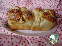 С оставшимися 3-мя шариками поступает так же. Выкладываем наши "цветочки" в смазанную маслом форму. Даем им подойти. Смазываем желтком и присыпаем кунжутом. |