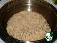 И помещаю его в форму для выпечки, в последнее время эта форма меня подводит, поэтому я застелила её бумагой, если у вас хорошая форма, то это делать не обязательно. Оставляю, прикрыв полотенцем в теплом месте, до увеличения в два раза, это заняло у меня 40 минут. В это время включаю духовку на разогрев до 200 градусов.